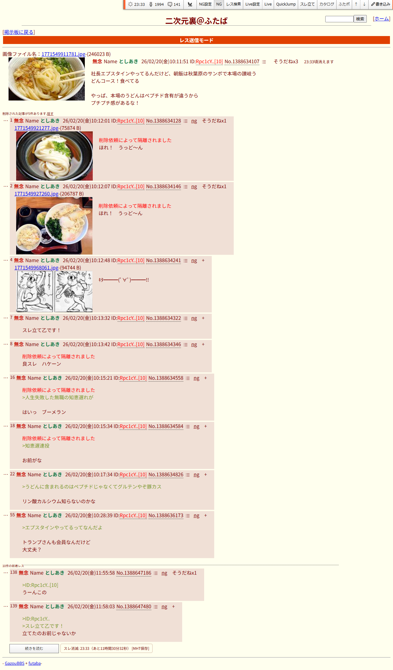 | … | 33無念Nameとしあき26/02/20(金)10:20:59No.1388635241そうだねx3>>>うどんに含まれるのはペプチドじゃなくてグルテンやぞ豚カス |