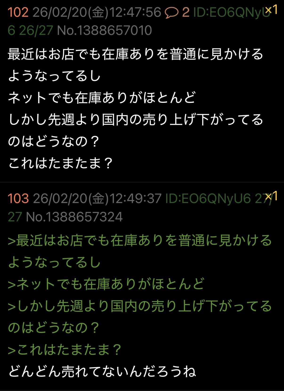 | … | 103無念Nameとしあき26/02/20(金)12:49:37 ID:EO6QNyU6No.1388657324そうだねx2>最近はお店でも在庫ありを普通に見かけるようなってるし |