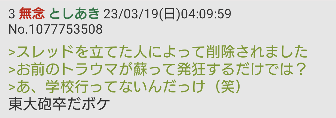 | … | 43無念Nameとしあき26/02/20(金)12:38:03No.1388655027+>クソスレ立てて助けろと喚いて壁打ちで方々のスレに粘着して迷惑かけることが戦うことなのかつまんねえ人生だな |