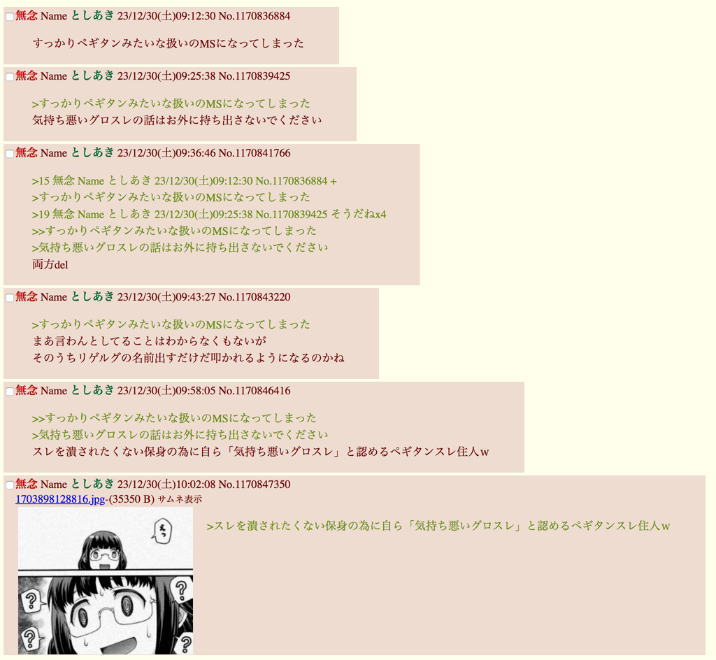 | … | 90無念Nameとしあき26/02/21(土)00:00:56No.1388801074そうだねx8>中年のクソジジイが「クリーンベレーガンダムがー」とか話しかけてんじゃねえよてめえのオタトークに木~海持つ女の子なんかいないね(笑) |