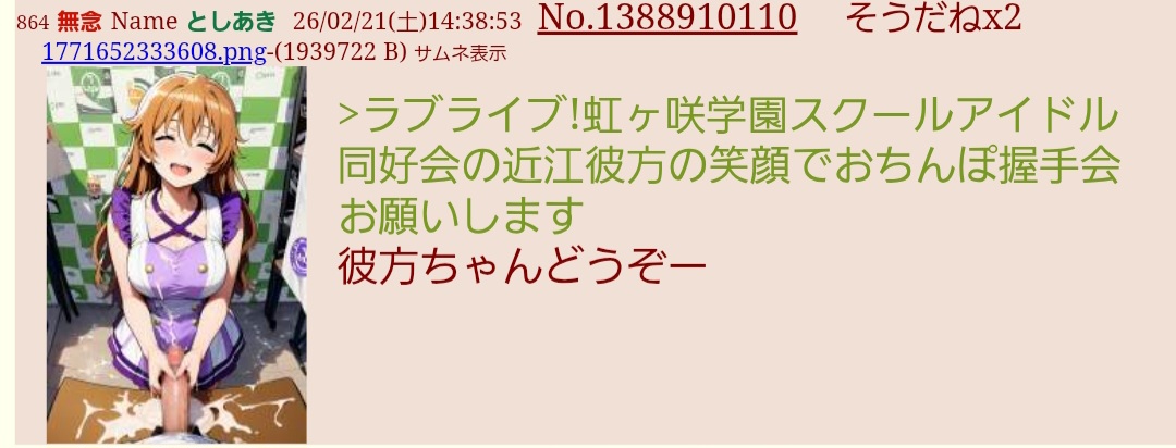 | … | 319無念Nameとしあき26/02/21(土)16:31:49No.1388932944+ 1771659109569.png-(1512965 B) >おちんぽ握手会をしてくれるラブライブ!サンシャイン!の松浦果南をお願いします |