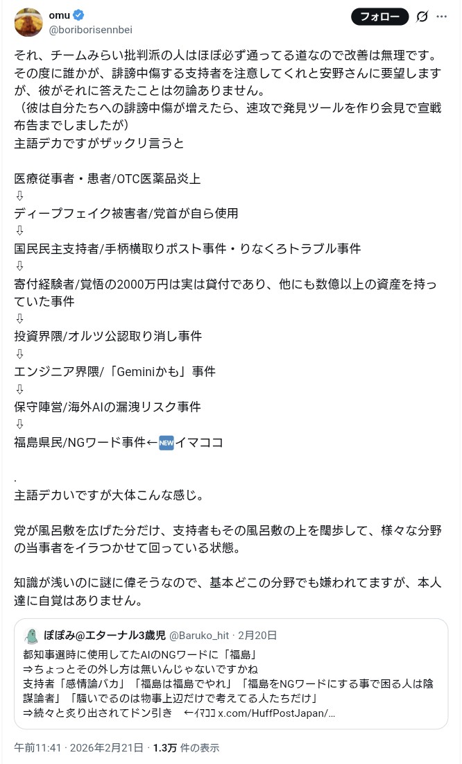 | … | 752無念Nameとしあき26/02/21(土)19:59:33No.1388980833+批判が集中して支持者が突然SNSに湧いてきたけど |