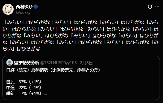 | … | 825無念Nameとしあき26/02/21(土)20:32:03No.1388990417+選挙直前まで最下位争いしてた支持率が選挙直後に野党トップになる理屈説明してくんない? |