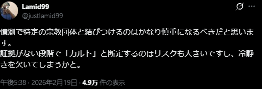 | … | 79無念Nameとしあき26/02/21(土)17:44:17No.1388947307そうだねx3>バックに新興宗教が付いてるってマジ? |