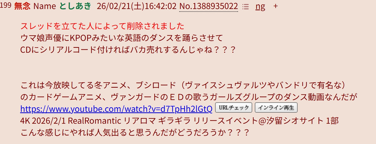 | … | 21無念Nameとしあき26/02/21(土)17:58:59No.1388950313+ 1771664339379.jpg-(334918 B) >オタクなんて人気声優がダンスすりゃすぐ食いつくっしょ |