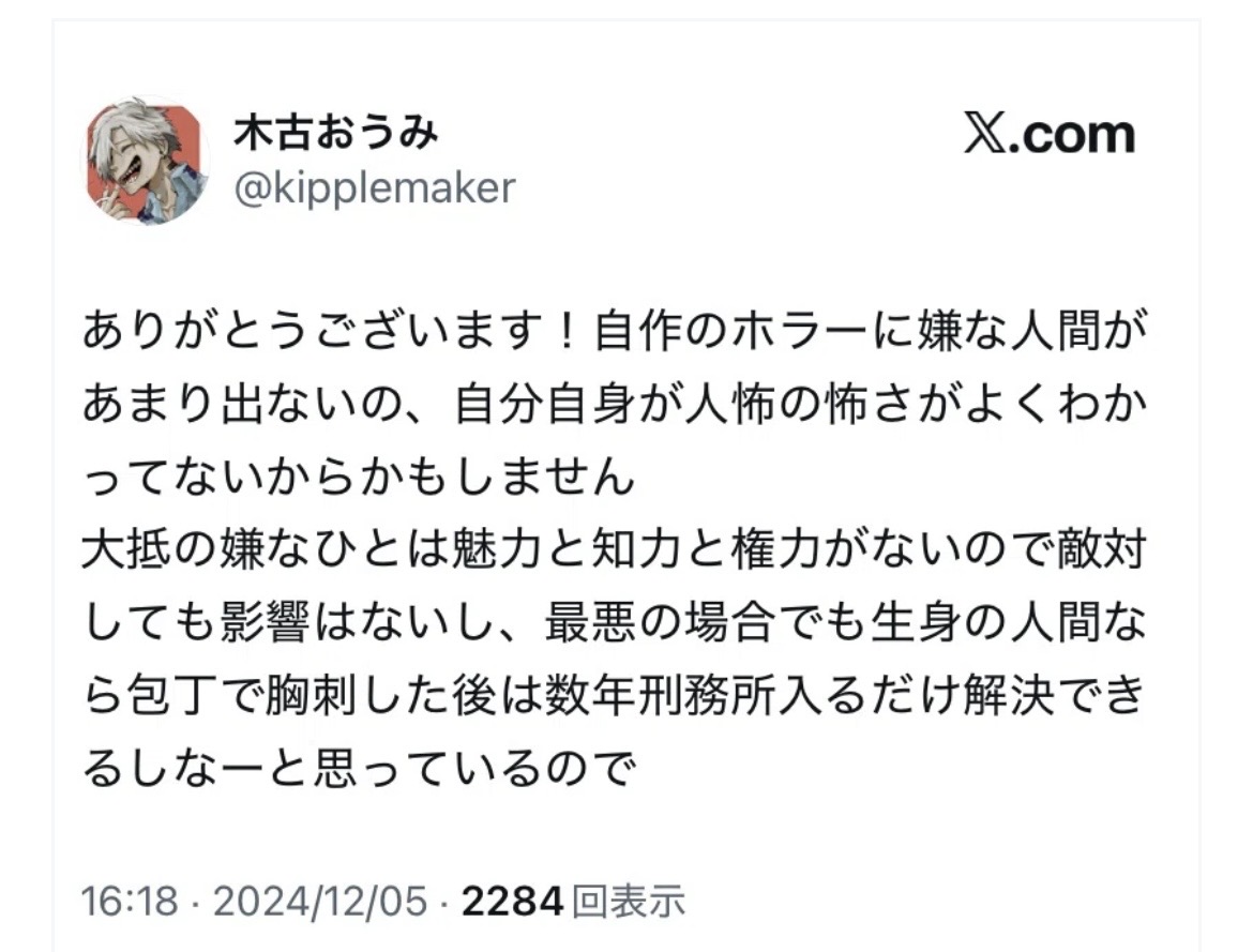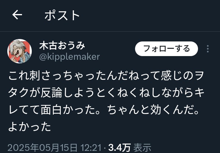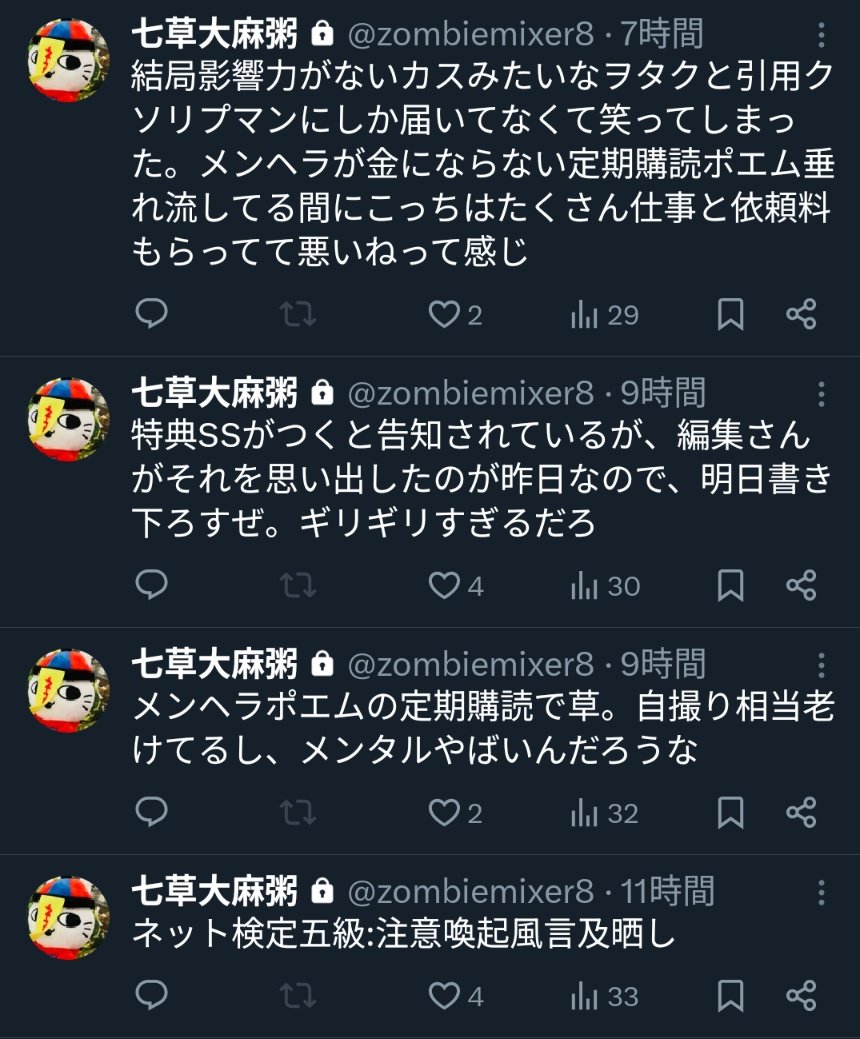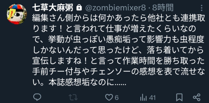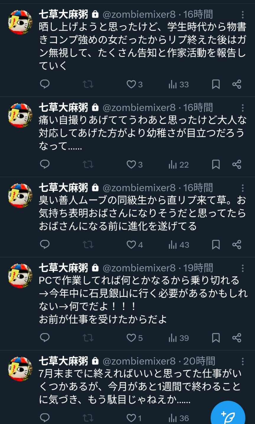 | … | 80無念Nameとしあき26/02/21(土)18:14:22No.1388953598そうだねx7そんなに複垢作る発想があるならまず呪詛専用の捨て垢風公開垢でも作って作家垢で変なこと呟くなよ |