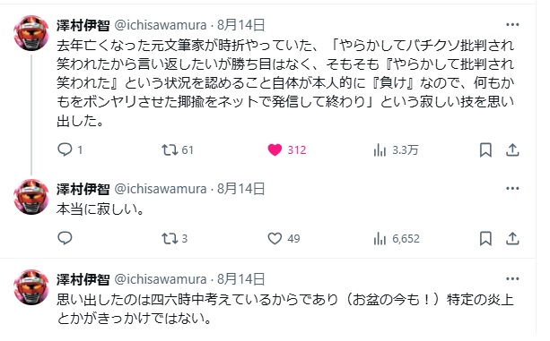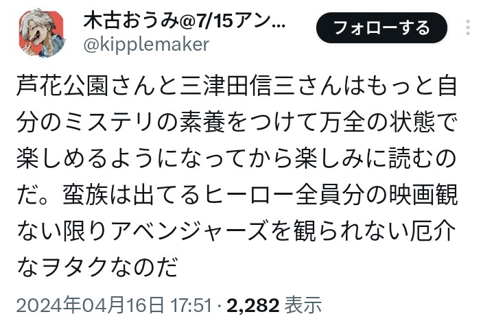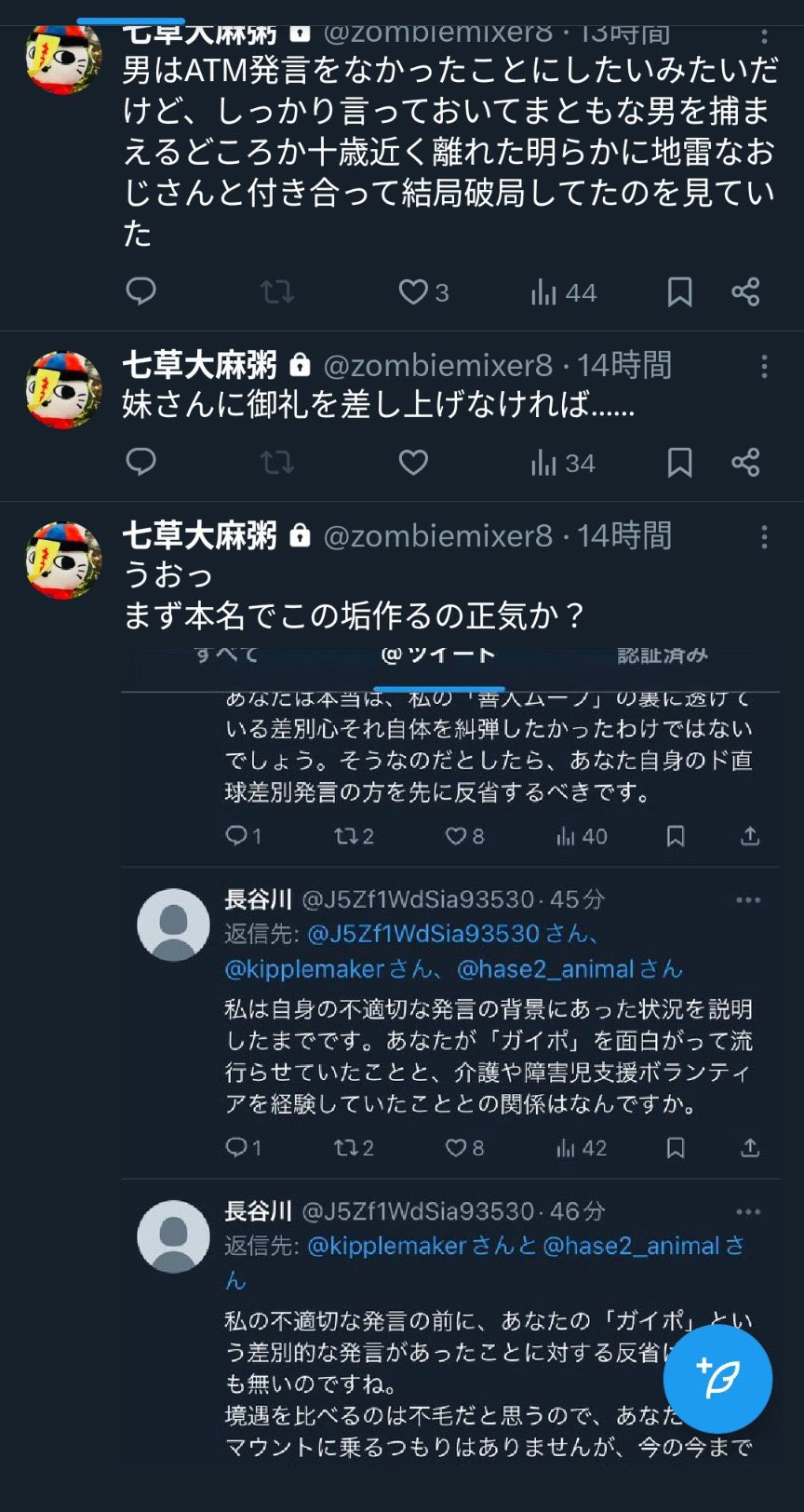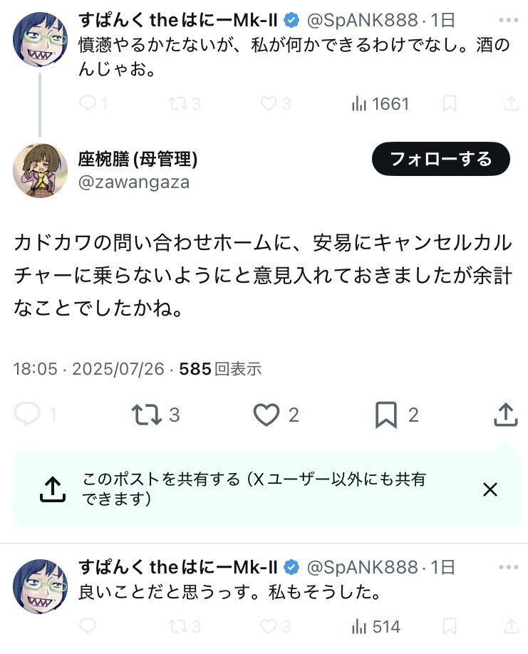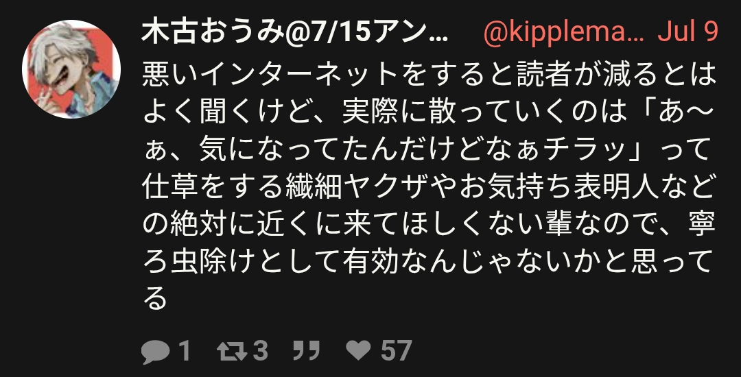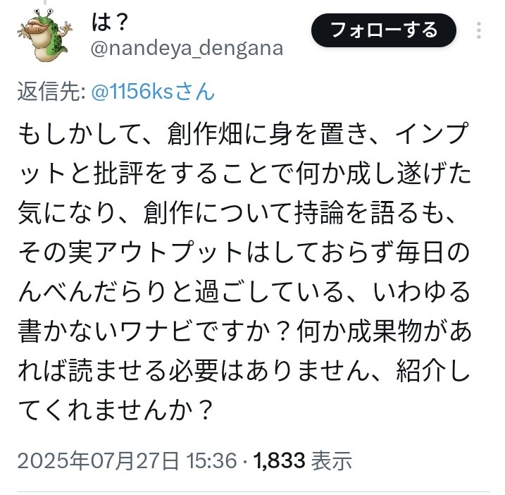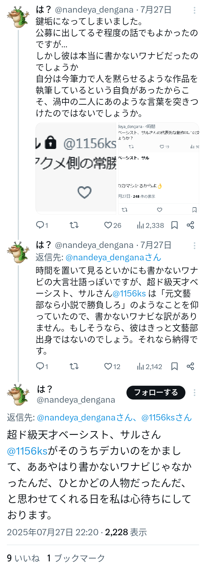 | … | 80無念Nameとしあき26/02/21(土)18:14:22No.1388953598そうだねx7そんなに複垢作る発想があるならまず呪詛専用の捨て垢風公開垢でも作って作家垢で変なこと呟くなよ |