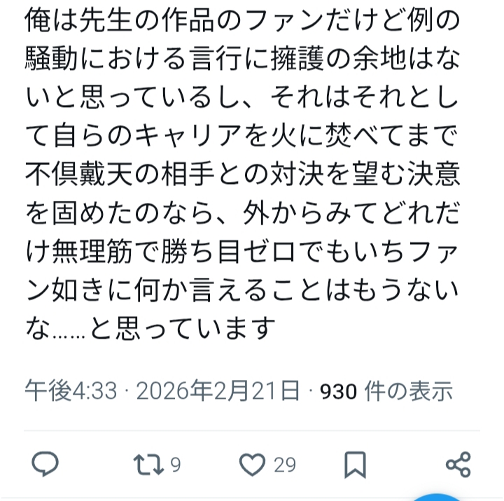 | … | 935無念Nameとしあき26/02/21(土)19:52:57No.1388978940そうだねx2>Hさんとっくに裁判上等だろうな |
