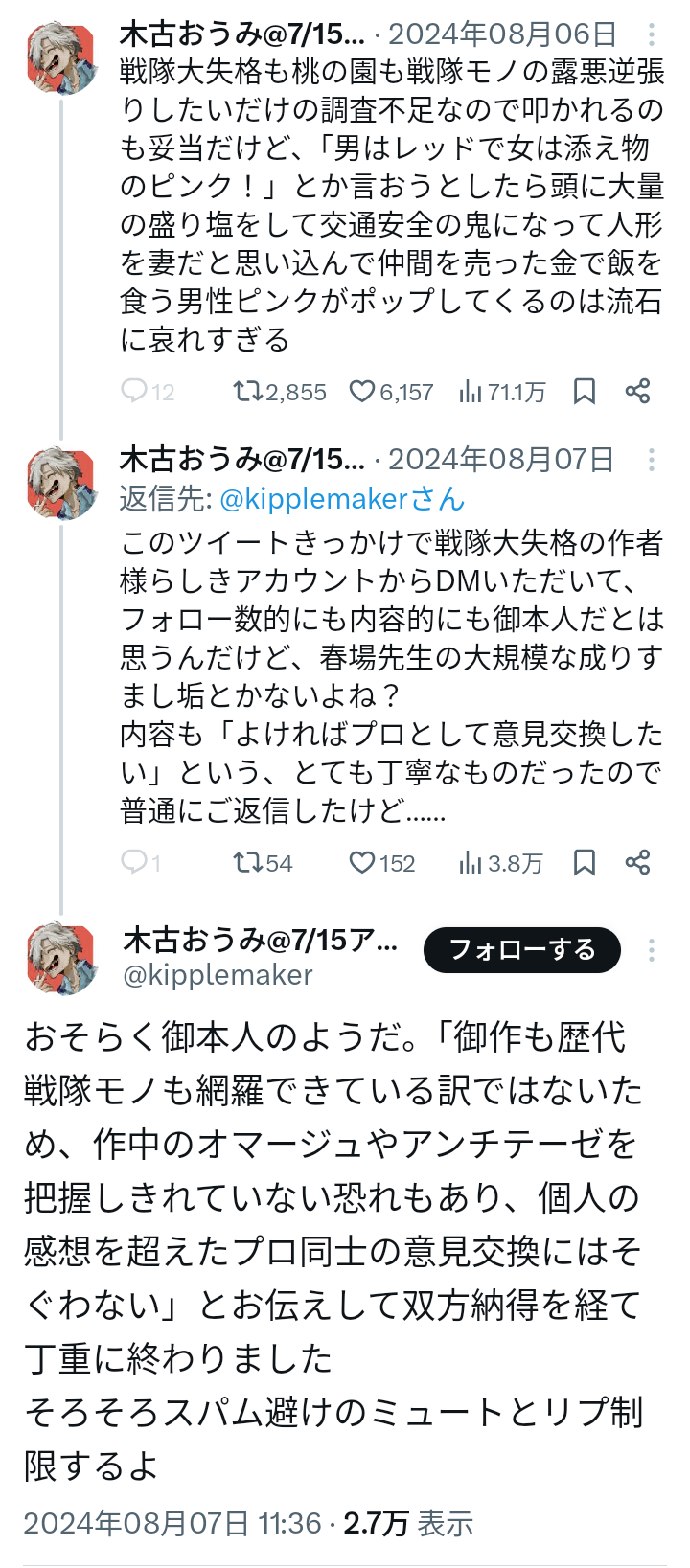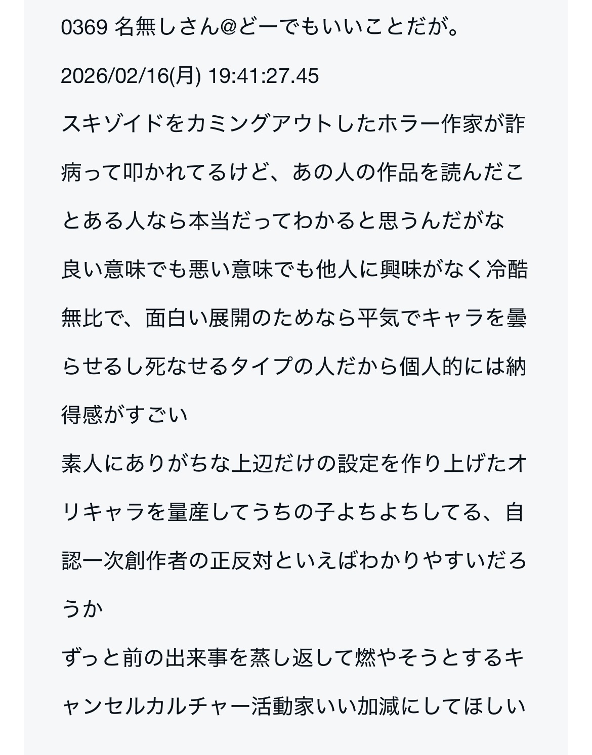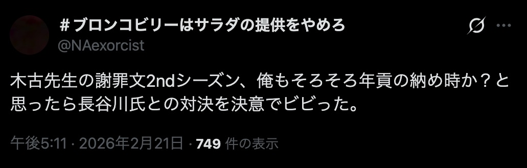 | … | 999無念Nameとしあき26/02/21(土)19:58:50No.1388980616そうだねx1あの暴れっぷりで自称スキゾイドとか通らない上にみっともないからやめたほうがいいすよ先生 |