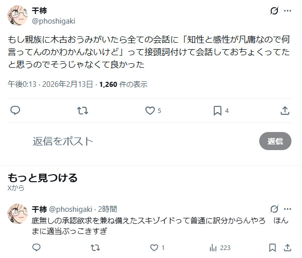 | … | 982無念Nameとしあき26/02/21(土)19:57:04No.1388980146+>スキゾイドって日本語に直すと精神病質とかだった気がするけど木古先生はそれでいいんですかね? |