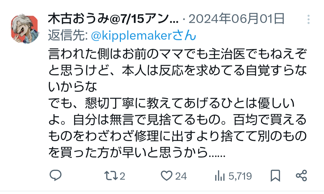| … | 987無念Nameとしあき26/02/21(土)19:58:03No.1388980401+>>スキゾイドって日本語に直すと精神病質とかだった気がするけど木古先生はそれでいいんですかね? |