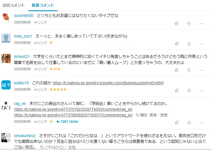 | … | 956無念Nameとしあき26/02/21(土)19:54:49No.1388979521そうだねx3先生の常套手段はレッテル貼りと冷笑してからブロックだったけどHさんは何度も諦めずに捨て垢作って食い下がったのが偉い |