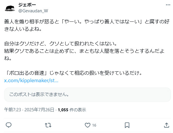 | … | 44無念Nameとしあき26/02/21(土)18:09:31No.1388952607そうだねx4自分の欲求を抑えきれずポチポチSNSに好き放題書くタイプの人がきっちり生きてきた人に勝てるわけがないのだ |