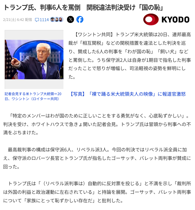 | … | 31無念Nameとしあき26/02/21(土)18:13:28No.1388953419そうだねx5判決でトランプに忖度した事実を歴史に刻まれていいと思った判事が3人いたんだよな |