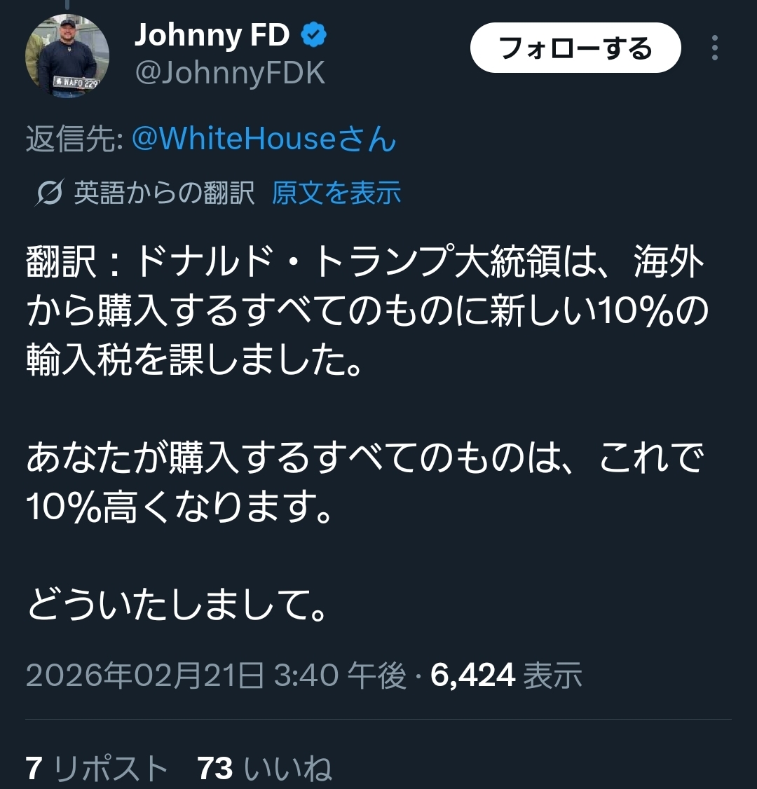 | … | 81無念Nameとしあき26/02/21(土)18:26:16No.1388956077+24日から各国一律10%の上乗せ課税だってさ |