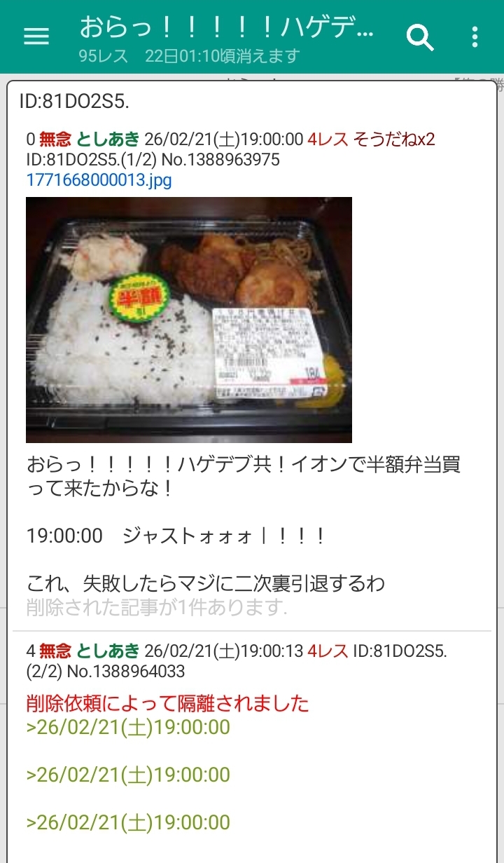 おらっ!!!!!ハゲデブ共!イオンで半額弁当買って来たからな!削除された記事が1件あります.見る