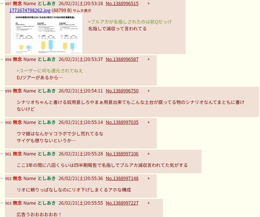 | … | 20無念Nameとしあき26/02/21(土)22:13:02No.1389020532+ブルアニスレってブルアカコンテンツの売り上げに貢献してるだけなのになんでこんなに嫌われるわよ |
