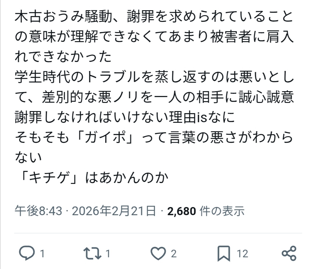 | … | 42無念Nameとしあき26/02/21(土)22:50:38No.1389031972そうだねx9>先生擁護をちらほら見るが大体過去の事を謝れいうならゲイの友達欲しいとか差別発言どうとか言ってて先生の印象操作に引っかかってる |