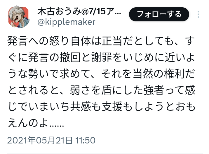 | … | 6無念Nameとしあき26/02/21(土)22:35:54No.1389027502+先生擁護をちらほら見るが大体過去の事を謝れいうならゲイの友達欲しいとか差別発言どうとか言ってて先生の印象操作に引っかかってる |