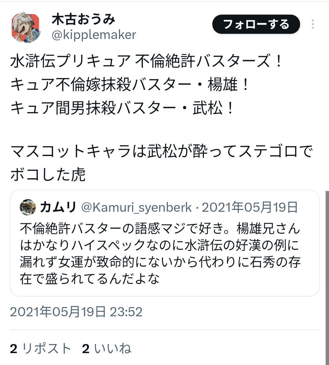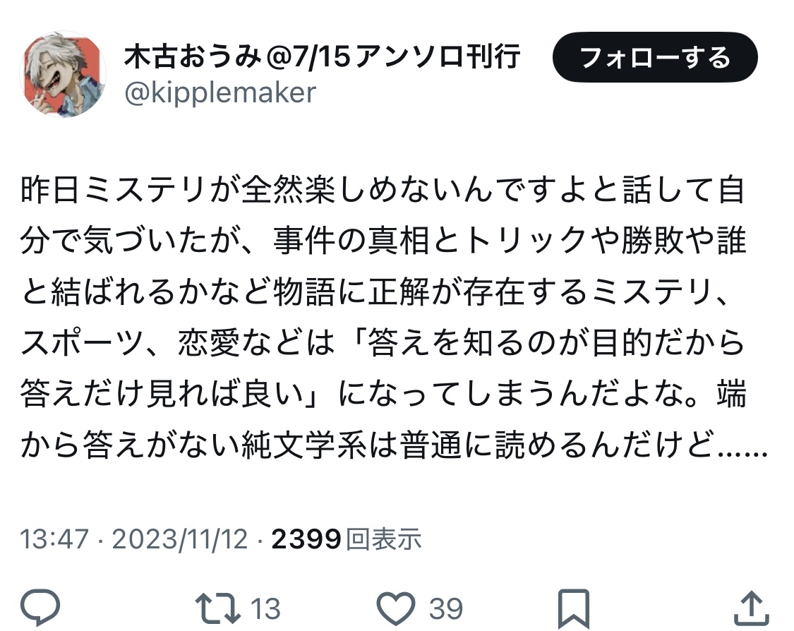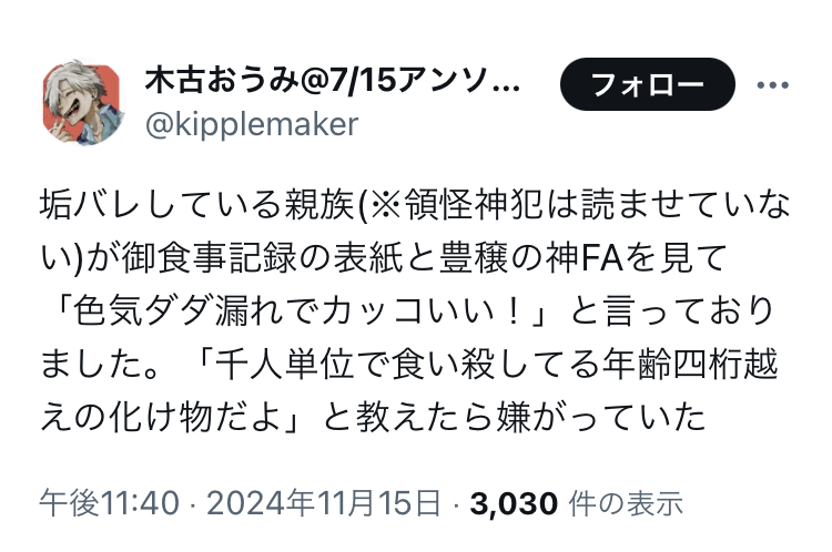 | … | 978無念Nameとしあき26/02/22(日)01:08:15No.1389064847+芦花公園のアカウント見てみたら公式美形出てくる小説書いてたっぽい…? |