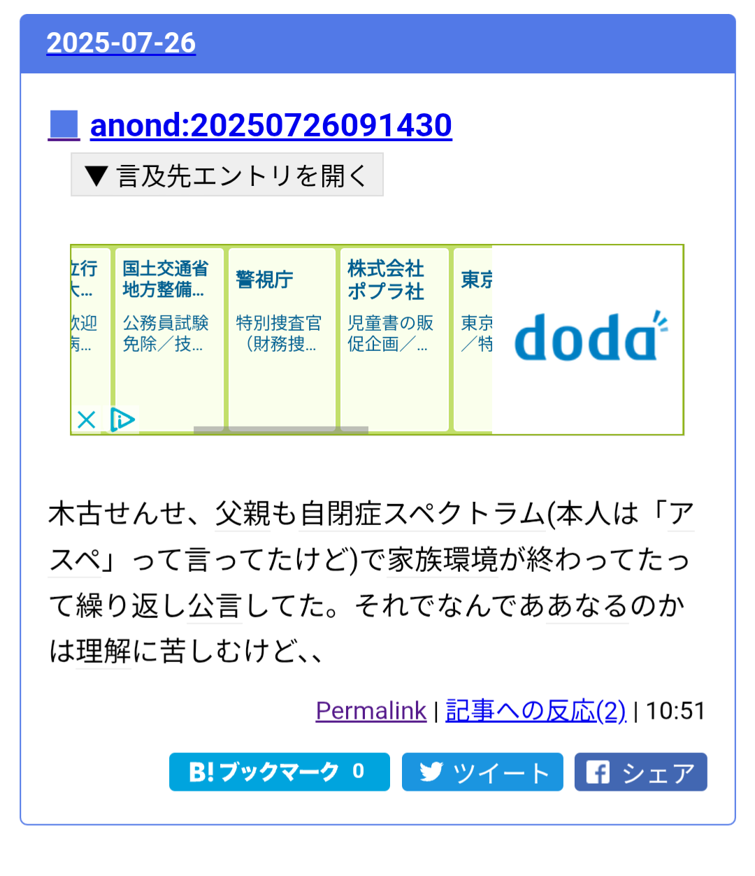 | … | 965無念Nameとしあき26/02/22(日)01:06:21No.1389064534そうだねx1>おうみスレちょこちょこ覗いてるけど見るたびに初見のカスツイートが貼ってあって怖い |