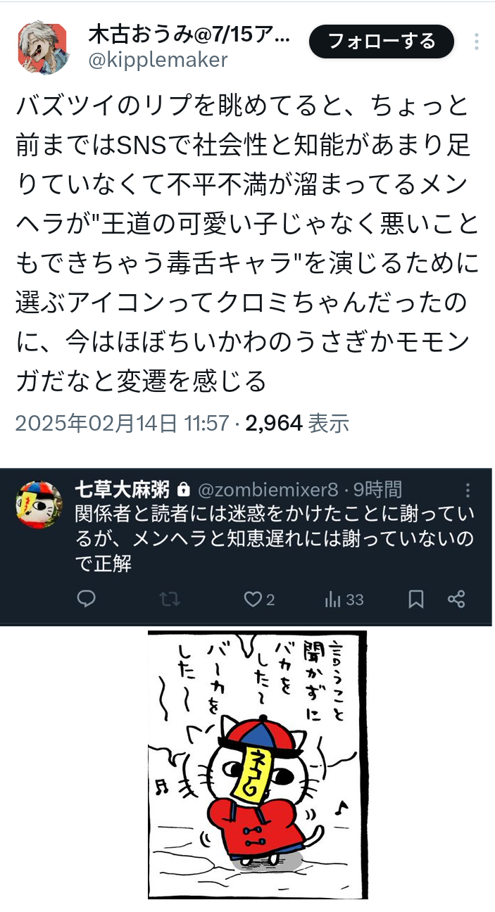 | … | 60無念Nameとしあき26/02/21(土)22:54:00No.1389033005そうだねx9 1771682040774.jpg-(486648 B) >こんだけ騒動広がったらちゃんと流れを読まずにいっちょ噛みするやつも出てくるわな |