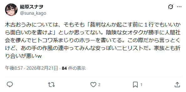 | … | 84無念Nameとしあき26/02/21(土)22:58:56No.1389034391そうだねx13文筆業コンプある無産のはずのHさんが一日で8400いいねされて商業作家の先生が9日で1400いいねか |