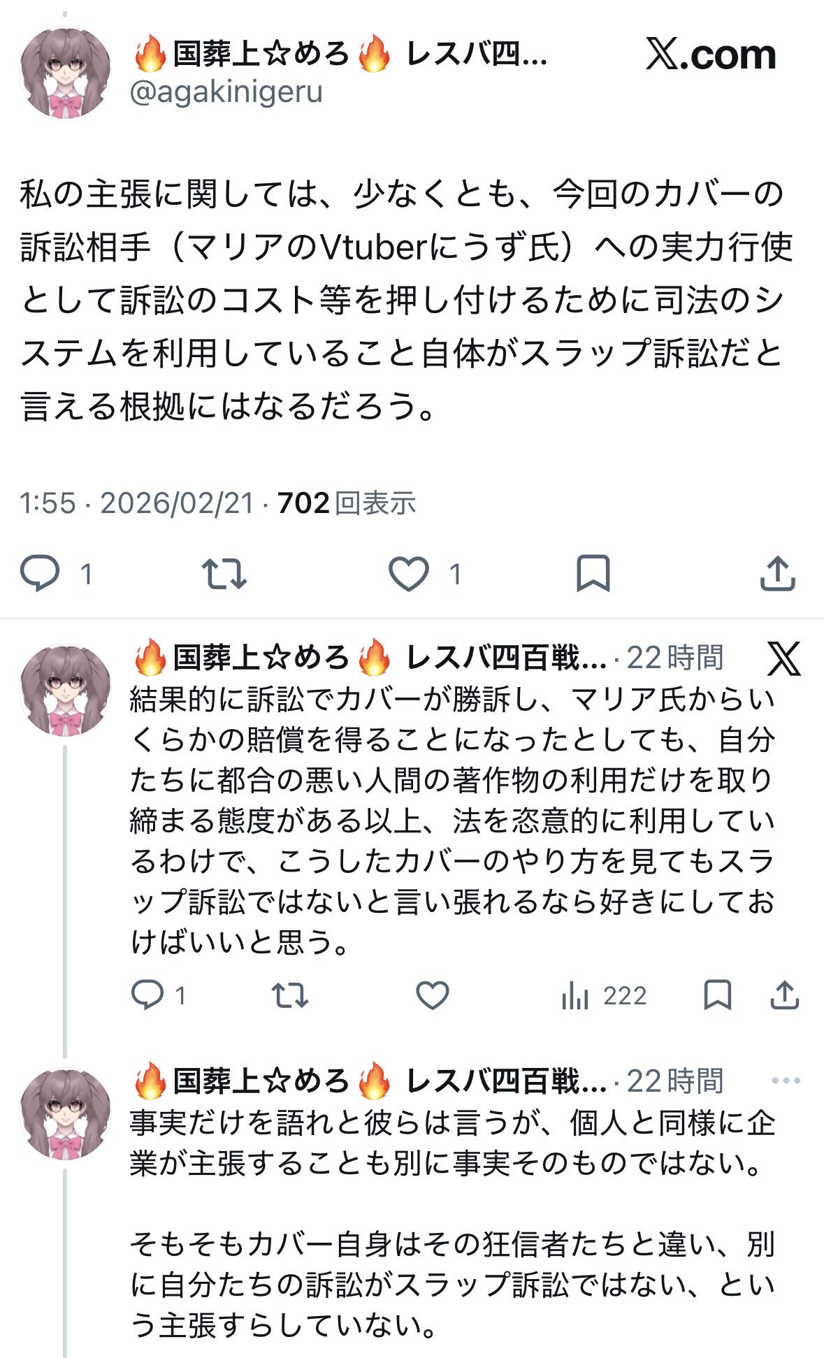 | … | 141無念Nameとしあき26/02/22(日)02:09:46No.1389073585+>漫画村の人も元気にしてるしマリアも裁判終わっら無敵の人になりそう |