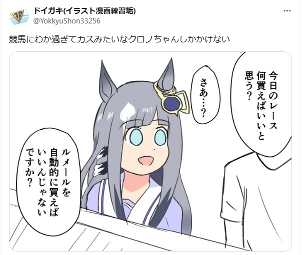 | … | 255無念Nameとしあき26/02/22(日)12:55:05No.1389152264+クロノちゃんくらいでいいから一緒に競馬見に行く友達欲しかった |