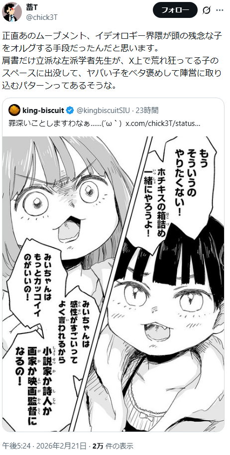 | … | 12無念Nameとしあき26/02/22(日)13:38:05 IP:14.10.*(enabler.ne.jp)No.1389162687+>傾聴を知るものよ来たれって呼び込んでんのかな |