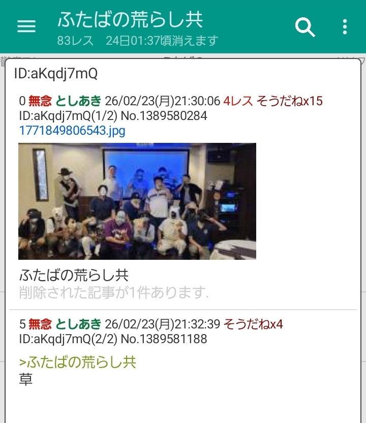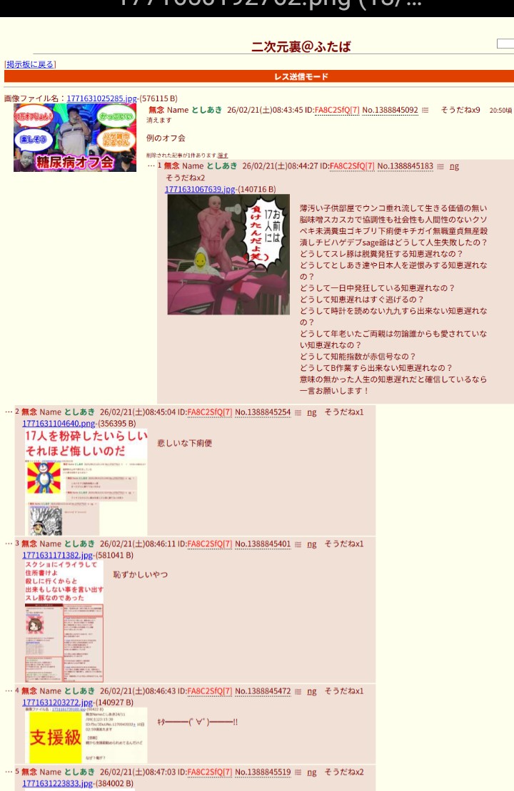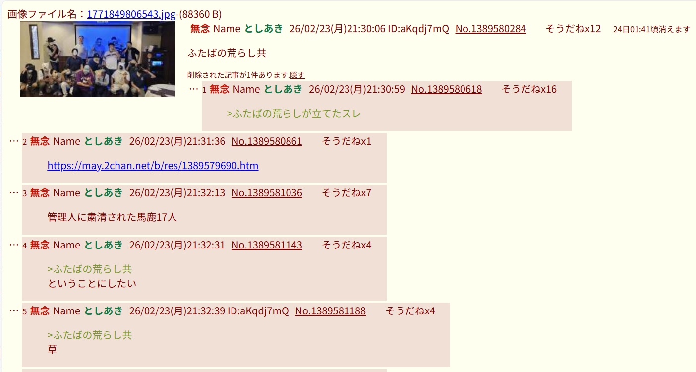 | … | 43無念Nameとしあき26/02/23(月)21:50:17No.1389587524+>ふたばの荒らし共 |
