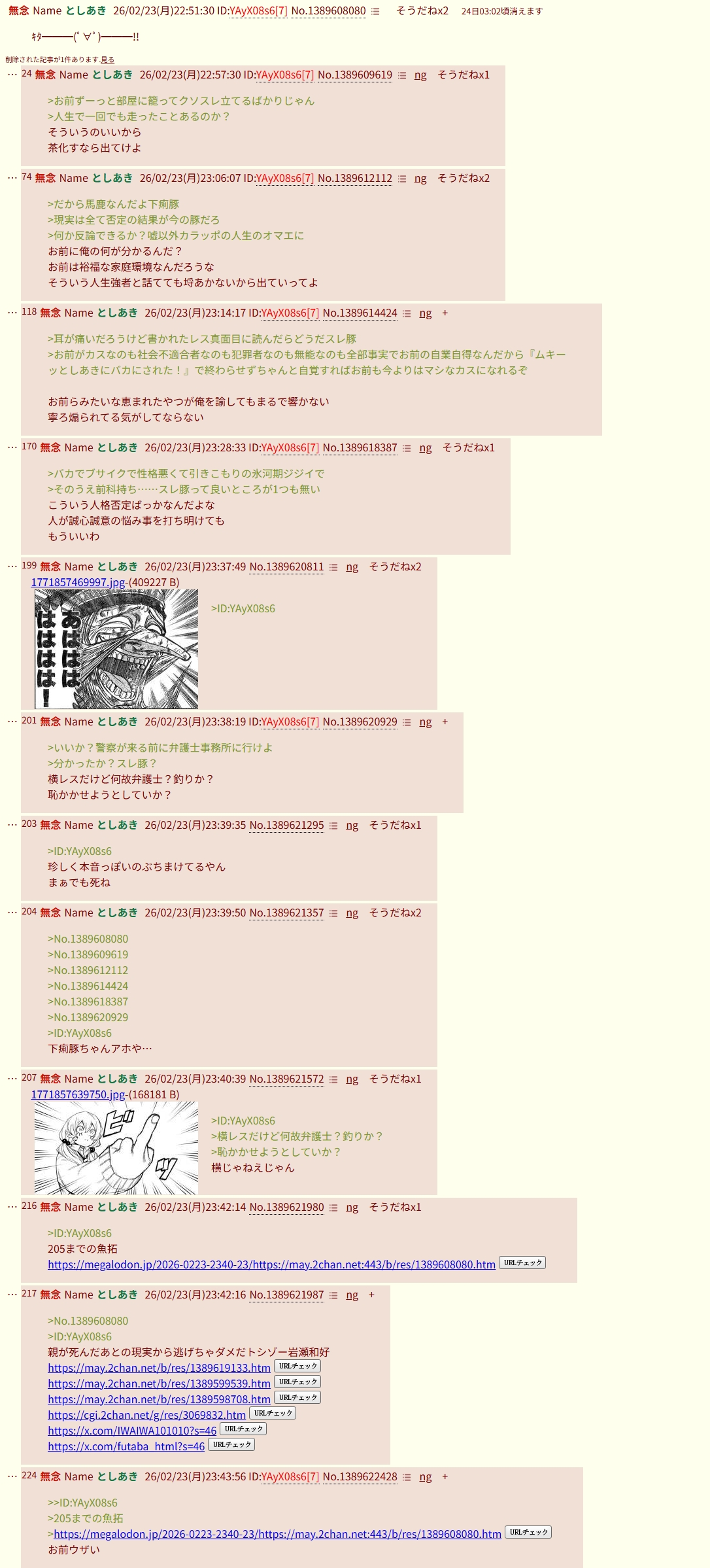 | … | 10無念Nameとしあき26/02/23(月)23:42:13No.1389621976+https://may.2chan.net/b/res/1389603059.htm |
