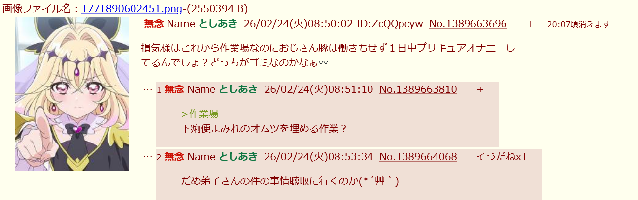 | … | 12無念Nameとしあき26/02/24(火)09:04:08No.1389665144そうだねx2 1771891448797.png-(230925 B) >早く仕事探ししろよいつまで戯れてるつもりだカス共 |