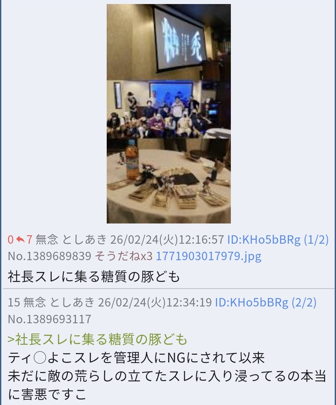 | … | 2無念Nameとしあき26/02/24(火)12:19:07No.1389690233そうだねx6 1771903147591.jpg-(281047 B) >社長スレに集る糖質の豚ども |