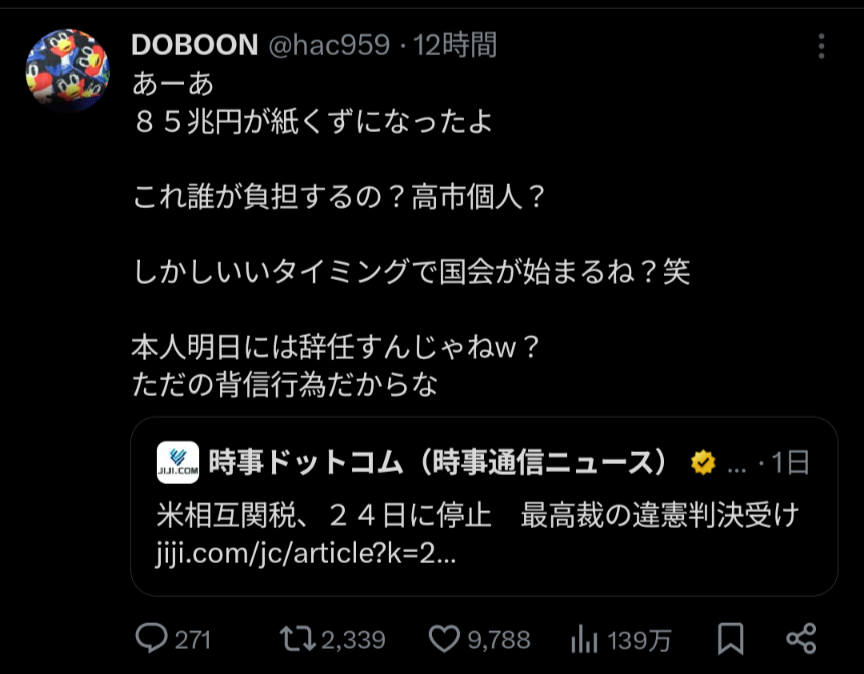 高市のせいで85兆円無駄になったけどどうしてくれるの?削除された記事が2件あります.見る