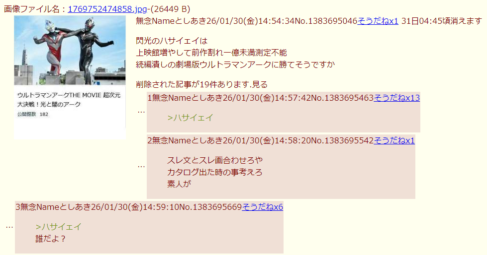 | … | 30無念Nameとしあき26/02/25(水)03:16:02No.1389858180そうだねx2>>おっと上映館ふやしたのに1億未満計測不能 |