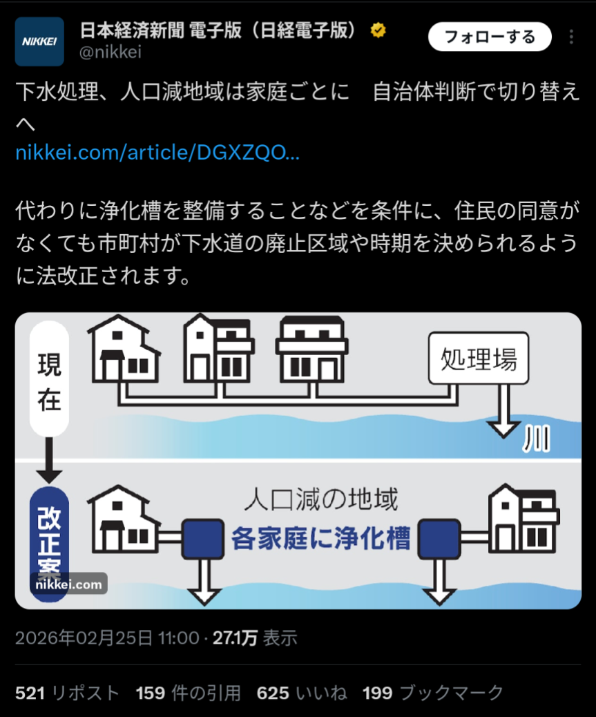 | … | 2無念Nameとしあき26/02/25(水)16:03:27No.1389944966そうだねx8>田舎、下水処理停止 |