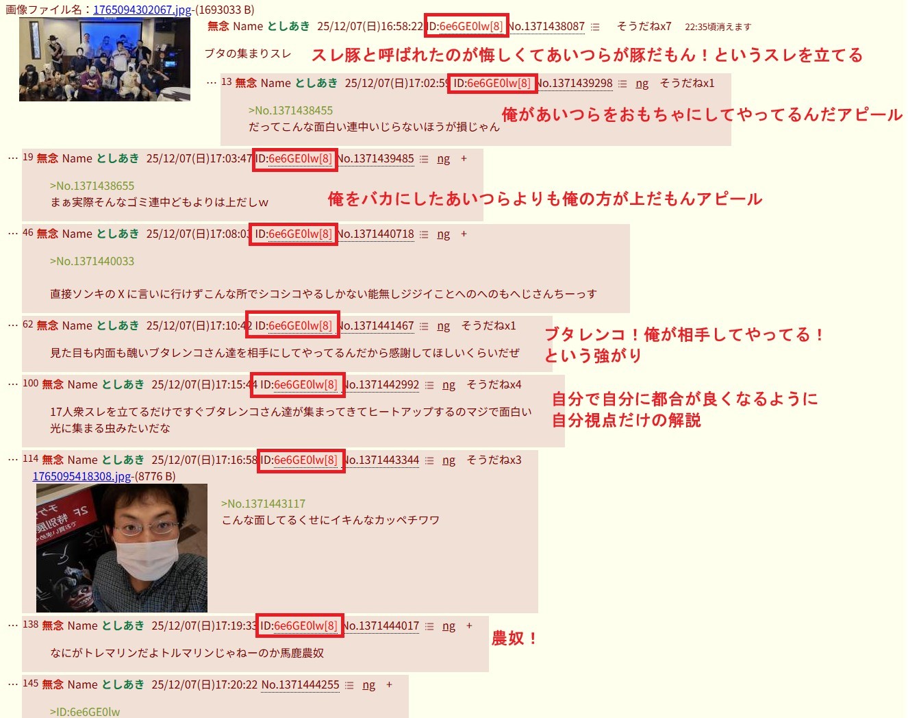 | … | 20無念Nameとしあき26/02/25(水)17:01:16No.1389954205そうだねx5 1772006476759.jpg-(274794 B) まぁオフ会写真貼るやつは自演してまで叩くクズだってとしあきは知ってるから意味ない工作だね(*´艸`) |