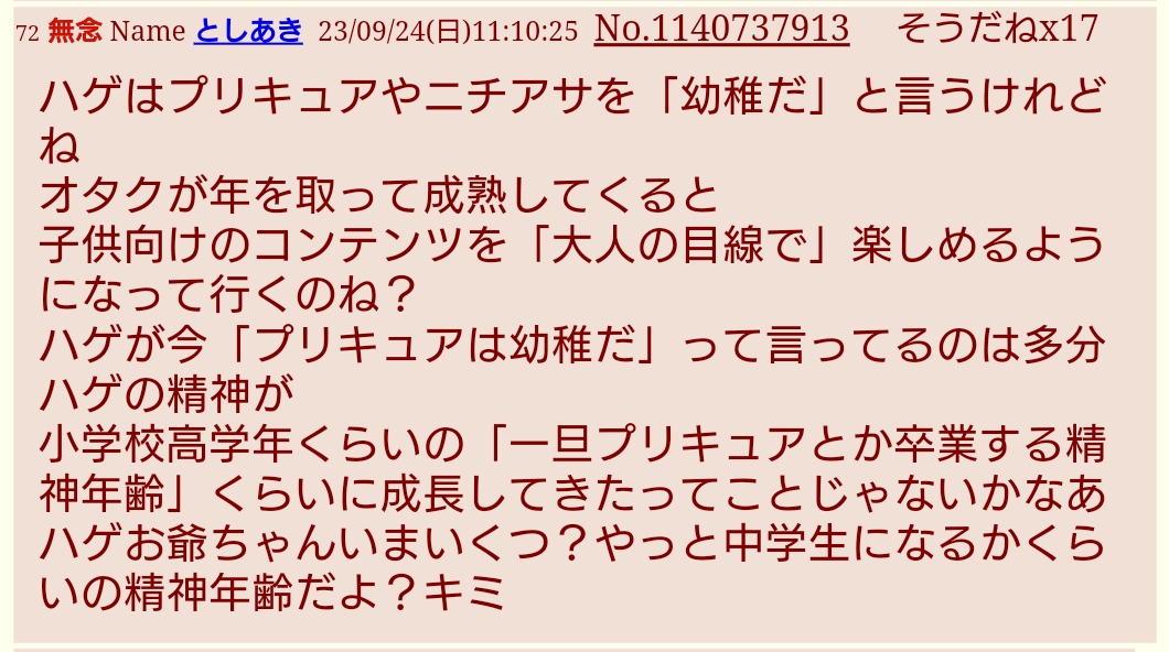 | … | 121無念Nameとしあき26/02/25(水)18:17:12No.1389967921そうだねx2荒らしはプリキュアに泣きつくとかあったな… |