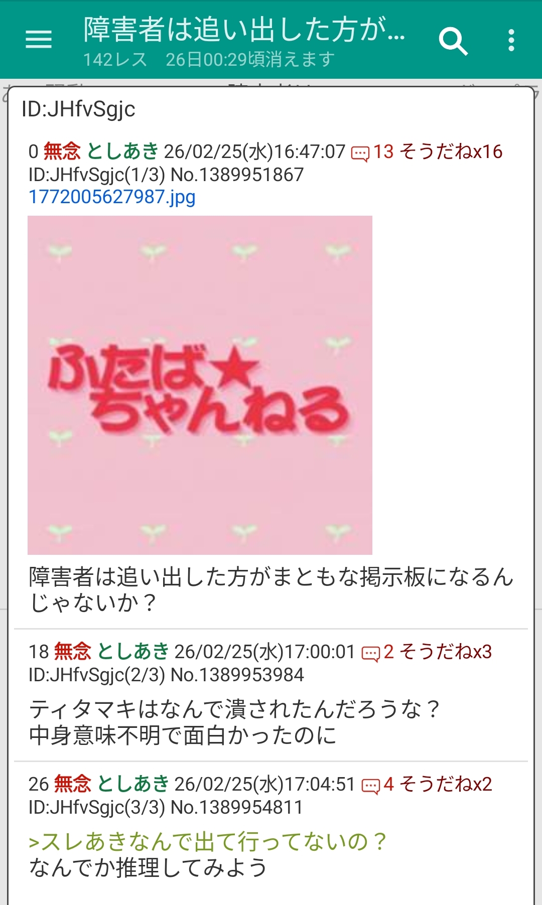 | … | 126無念Nameとしあき26/02/25(水)18:18:42No.1389968217+>障害者は追い出した方がまともな掲示板になるんじゃないか? |