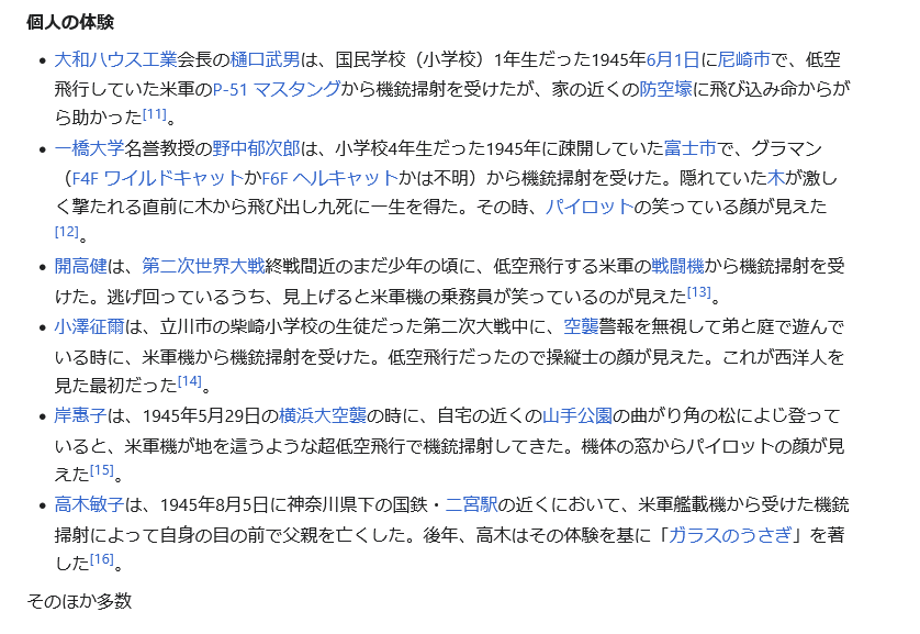 | … | 25無念Nameとしあき26/02/25(水)21:24:13No.1390017887+実際に戦闘機からの機銃は多くの人が体験してるから「米軍機からの機銃攻撃があった」は事実だろう |