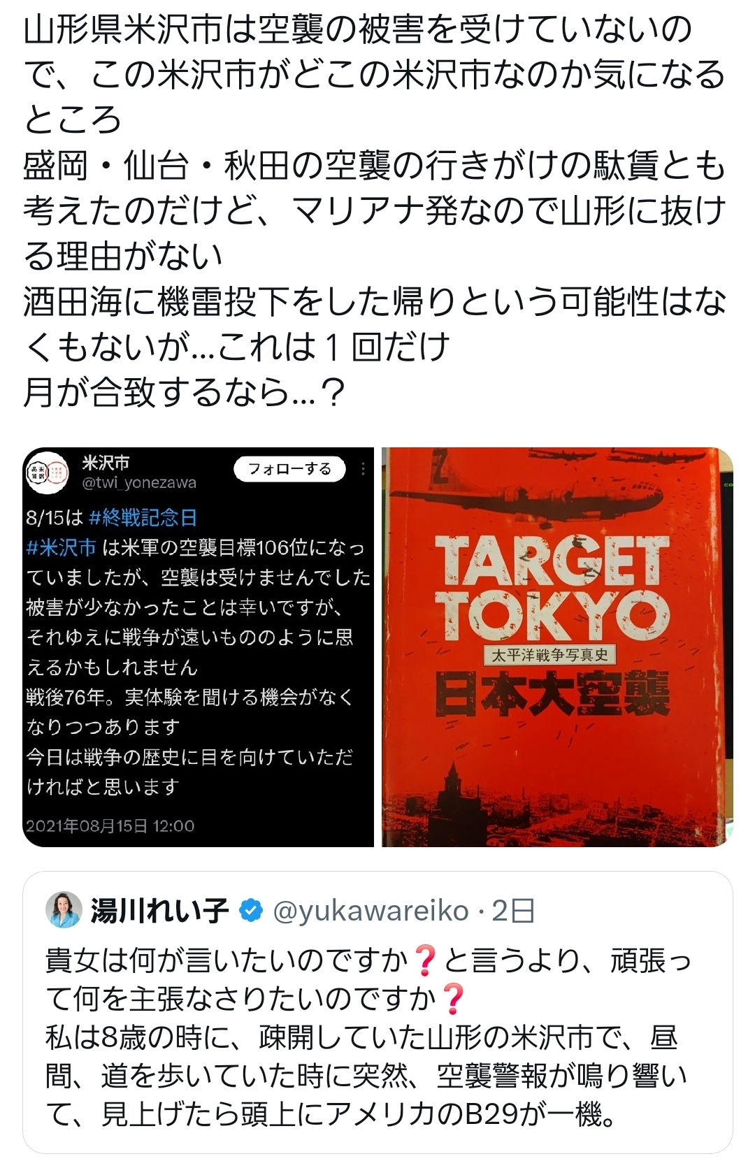 | … | 31無念Nameとしあき26/02/25(水)21:40:45No.1390022716+>米沢市が公式に「空襲は受けてない」って言ってるんですが湯川さんはどこの米沢で米軍機の機銃掃射受けたんですか? |