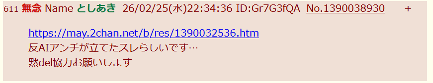 | … | 998無念Nameとしあき26/02/26(木)03:50:19No.1390078868+>初見で申し訳ないが会話の流れ関係なくAI生成物っぽいのペタペタ貼ってるのは別の半コテか荒らし? |