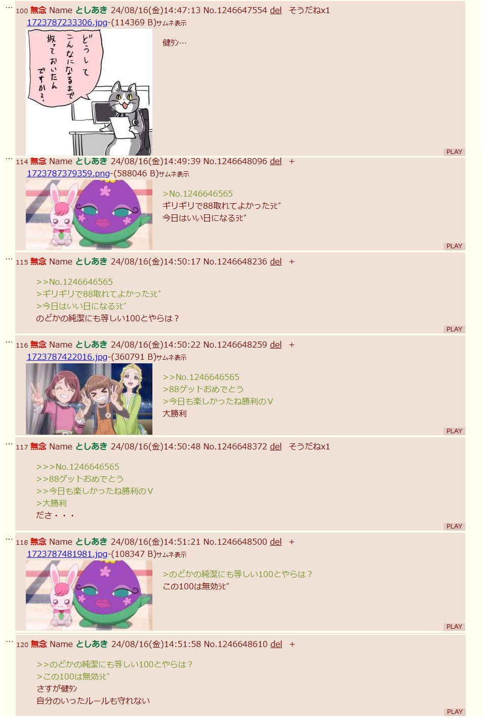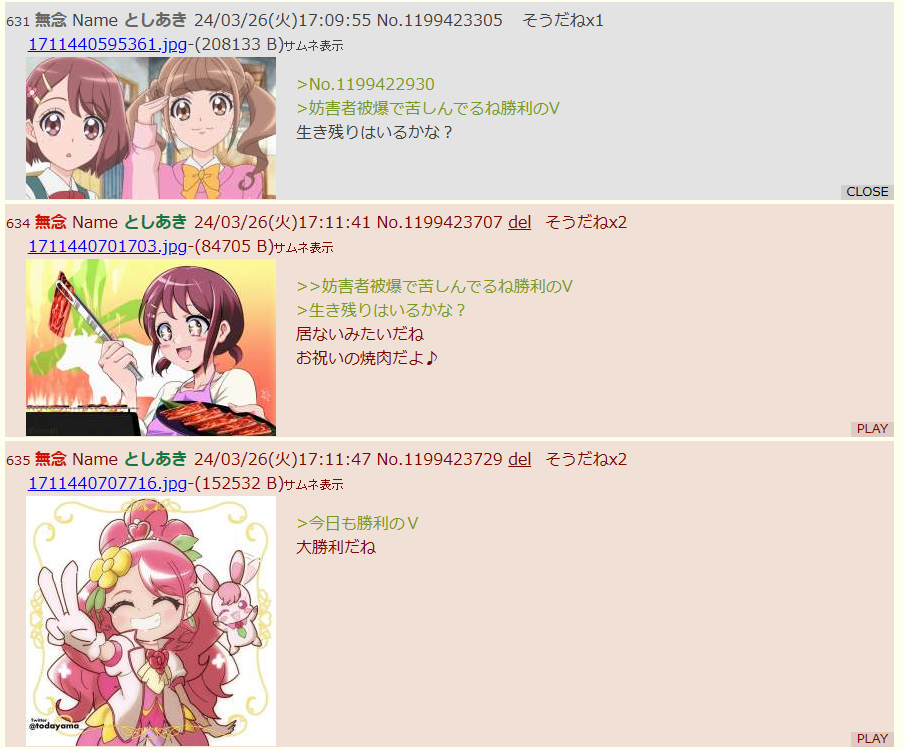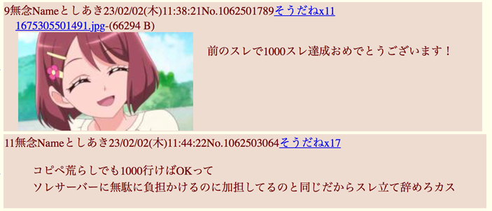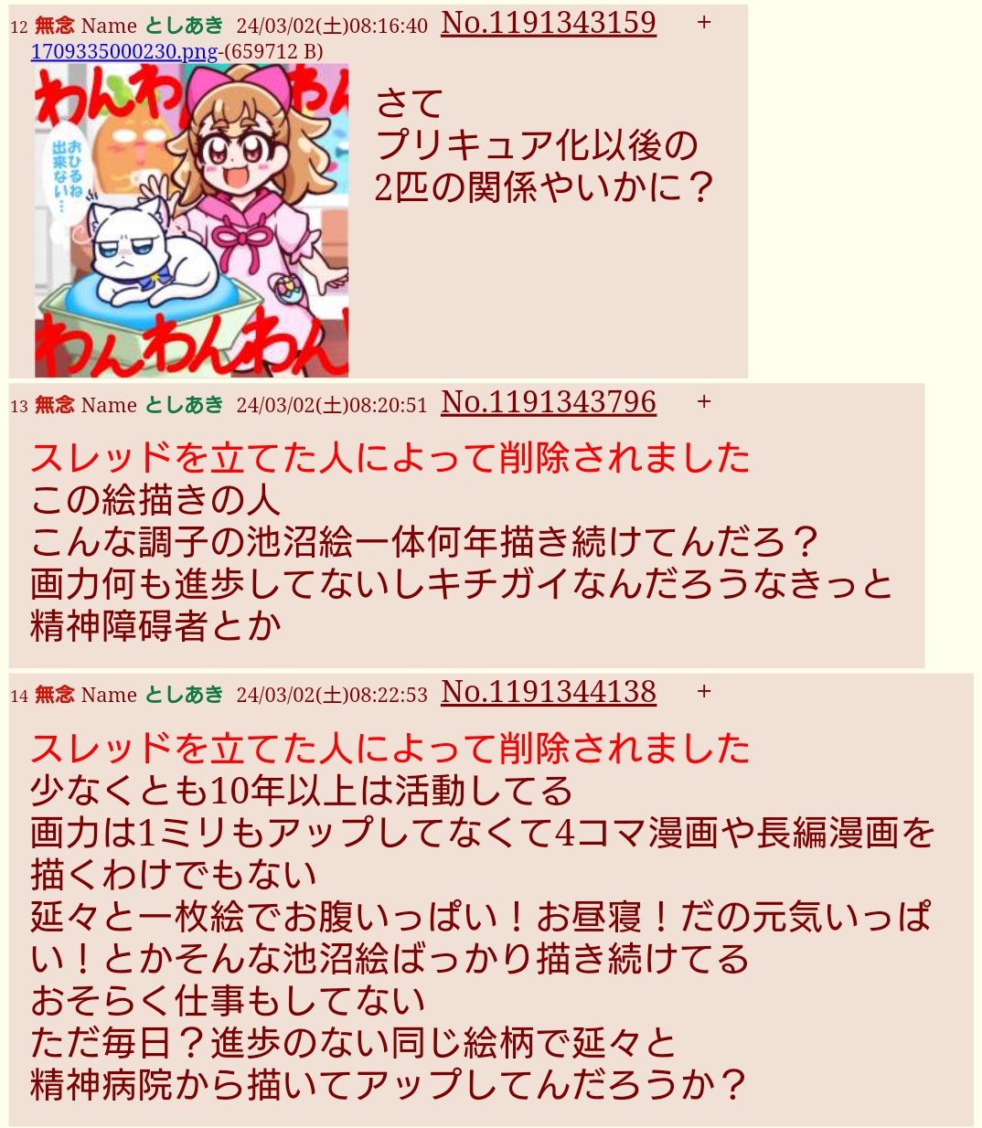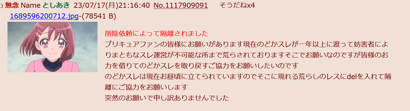 | … | 918無念Nameとしあき26/02/26(木)02:38:16No.1390076083そうだねx7>>今更だけど例のドラスレのアイツもプリキュアスレがどうこう喚いてたし |