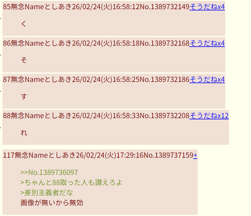 | … | 994無念Nameとしあき26/02/26(木)03:48:08No.1390078805そうだねx1>…いや一人のレスを抽出した結果がこれなのか… |
