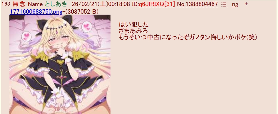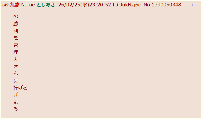 | … | 12無念Nameとしあき26/02/25(水)22:31:50No.1390038145そうだねx6>ID:JukNzj6c |