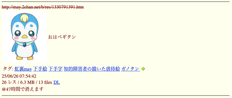 | … | 925無念Nameとしあき26/02/26(木)02:43:08No.1390076310そうだねx6淫夢スレが違法ってマジ!? |