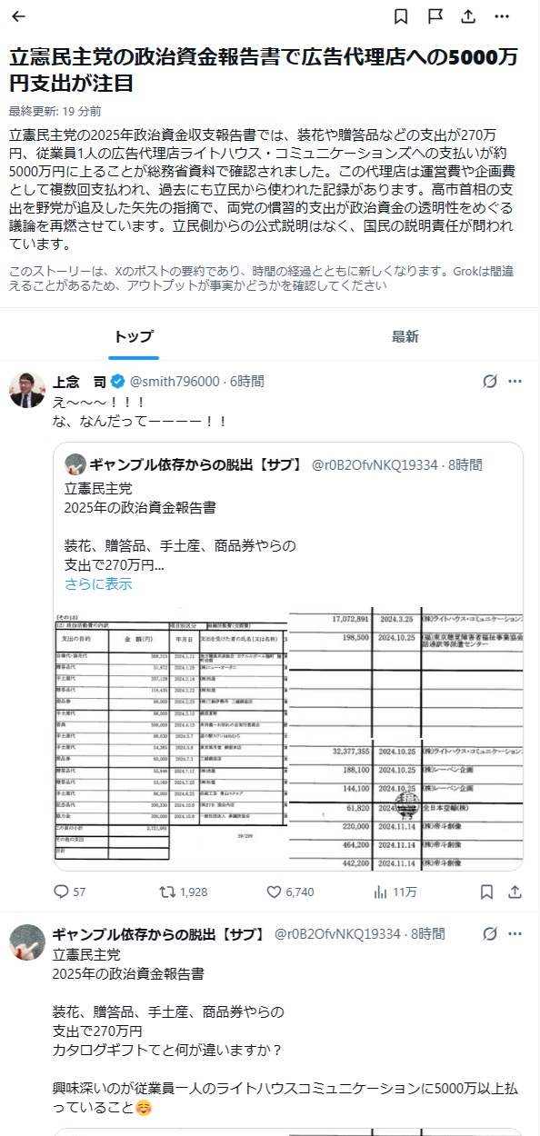 立憲民主党の2025年政治資金収支報告書では、装花や贈答品などの支出が270万円、従業員1人の広告代理店ライトハウス・コミュニケーションズへの支払いが約5000万円に上ることが総務省資料で確認されました。この代理店は運営費や企画費として複数回支払われ、過去にも立民から使われた記録があります。高市首相の支出を野党が追及した矢先の指摘で、両党の慣習的支出が政治資金の透明性をめぐる議論を再燃させています。立民側からの公式説明はなく、国民への説明責任が問われています。