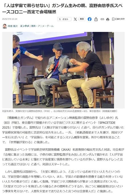 | … | 67無念Nameとしあき26/02/26(木)17:19:32No.1390168283+>宇宙空間と地球を結ぶエレベーター型の乗り物などアニメで描いた技術を紹介し、「アイデアを積み重ねることが必要だ。多角的に物事を考えていかないと、次の発想は生まれてこない」と指摘。「好奇心を持った子たちが、いっぱい出てきて、(旧世代ができなかったことを)突破できるよう頑張ってほしい」と呼びかけた。ー |