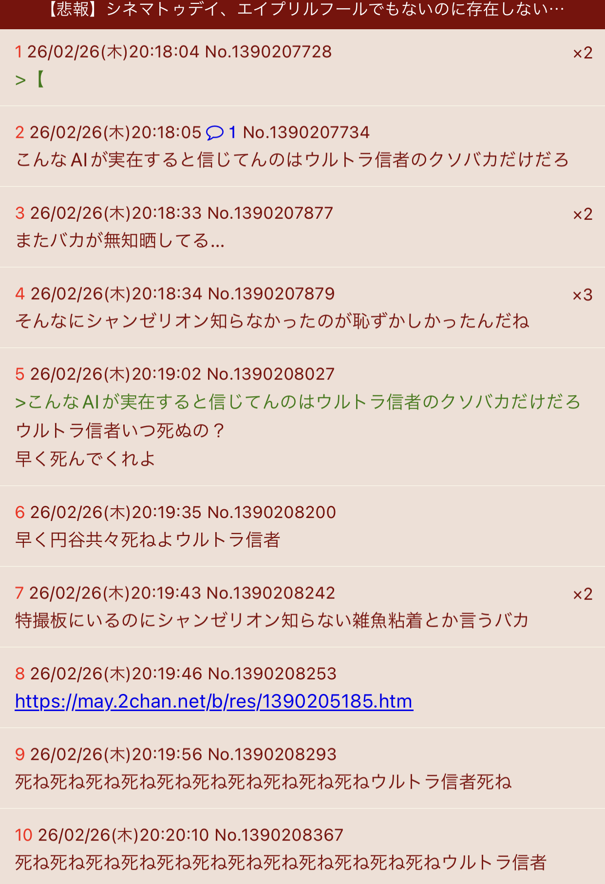 | … | 41無念Nameとしあき26/02/26(木)20:27:41No.1390210458そうだねx8>特撮板にいるのにシャンゼリオン知らないとかアホすぎるだろ雑魚粘着 |